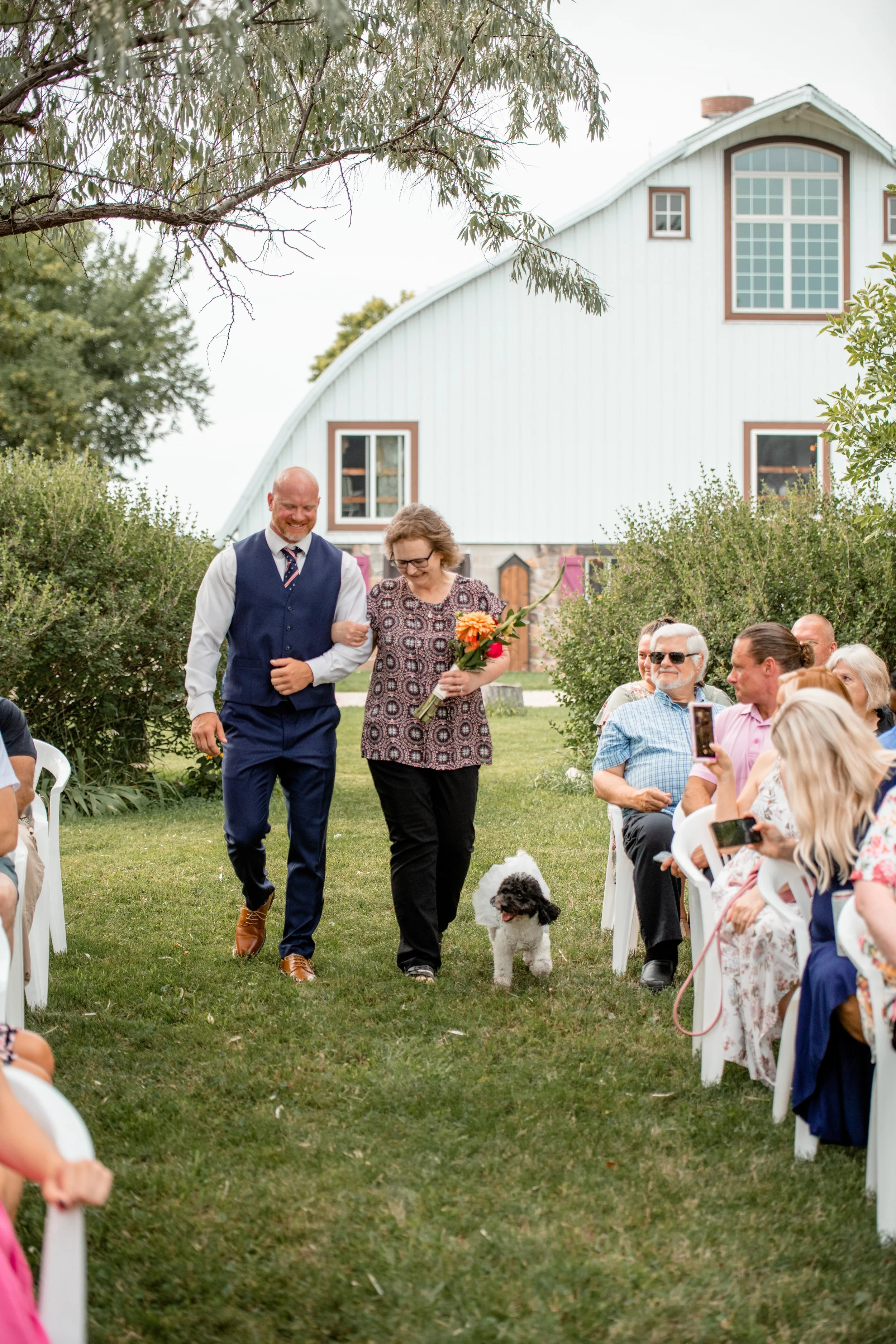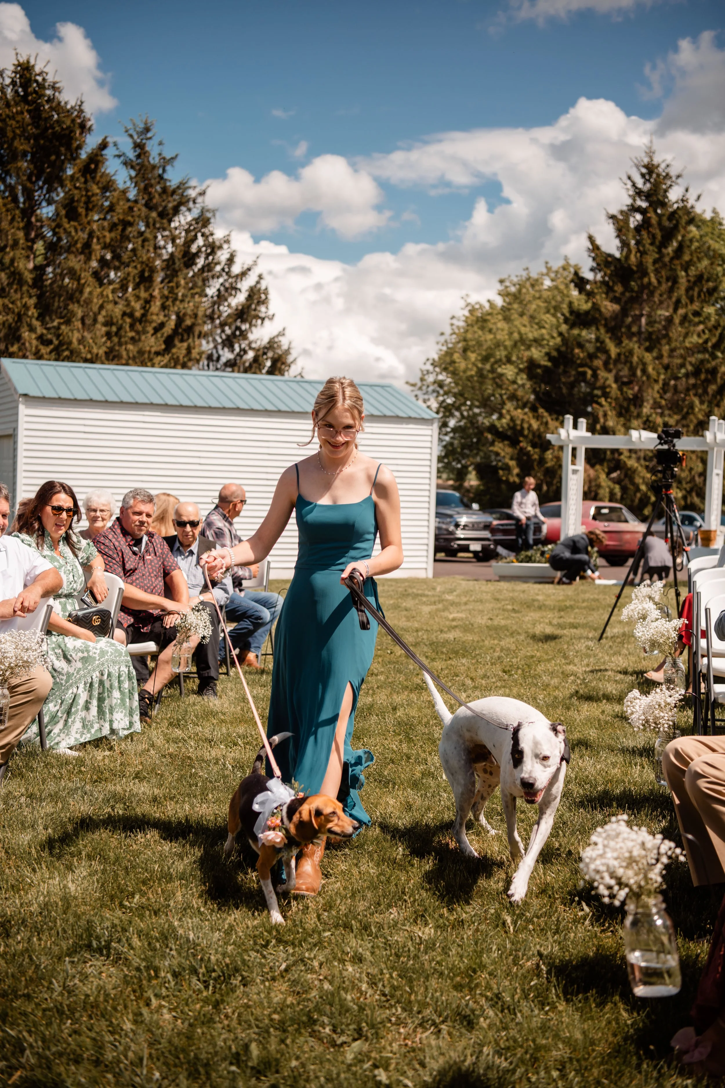 Include them in the ceremony and have them walk down the aisle in front of you. Some people have tied fake rings to the dog’s collar before and others have had their dogs carry flowers and wear tutus down to the front. Be as creative as you’d like with this the guests always love it and think it is so cute. It is also an alternative to having a traditional flower girl or ring bearer. You can also just have them on leashes and walk down with a bridesmaid or groomsman as well.